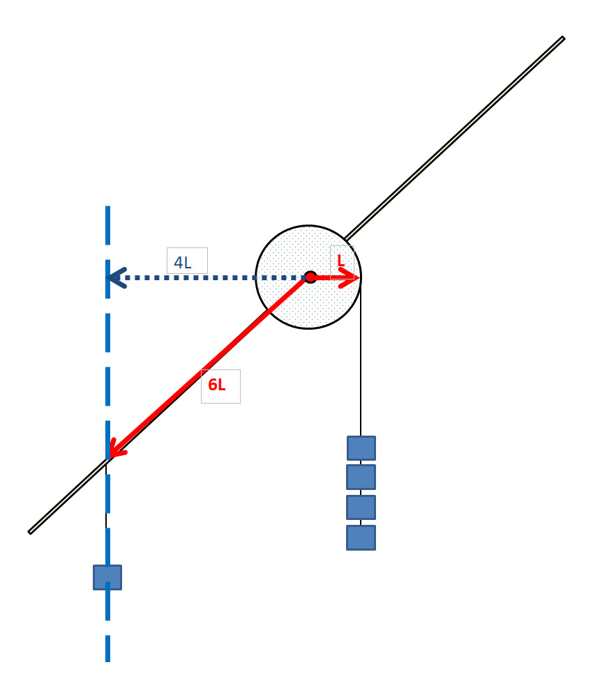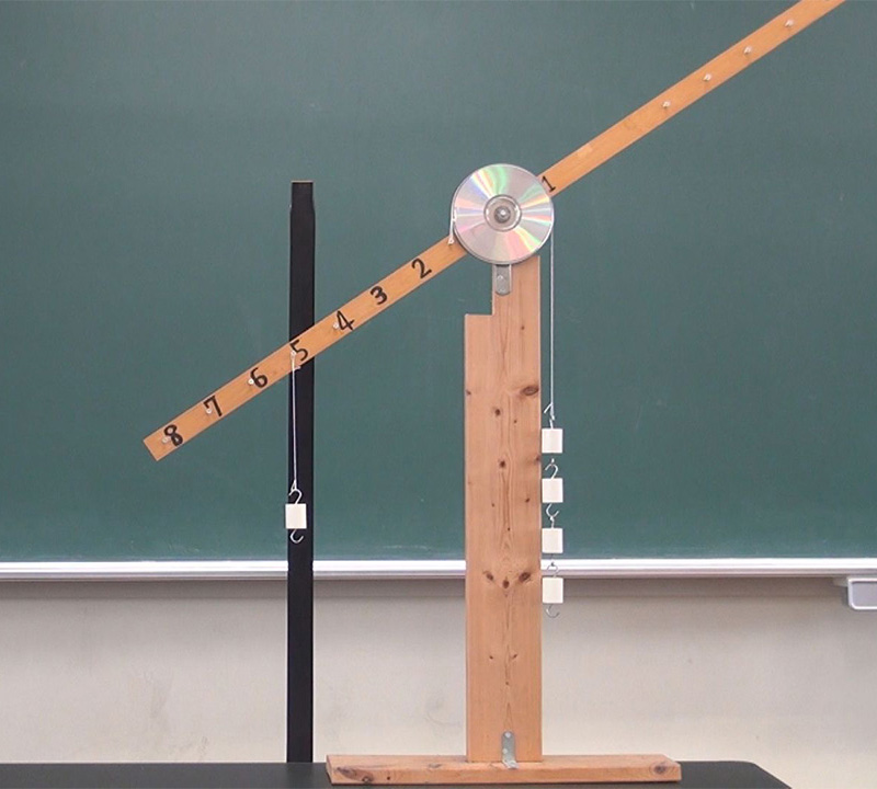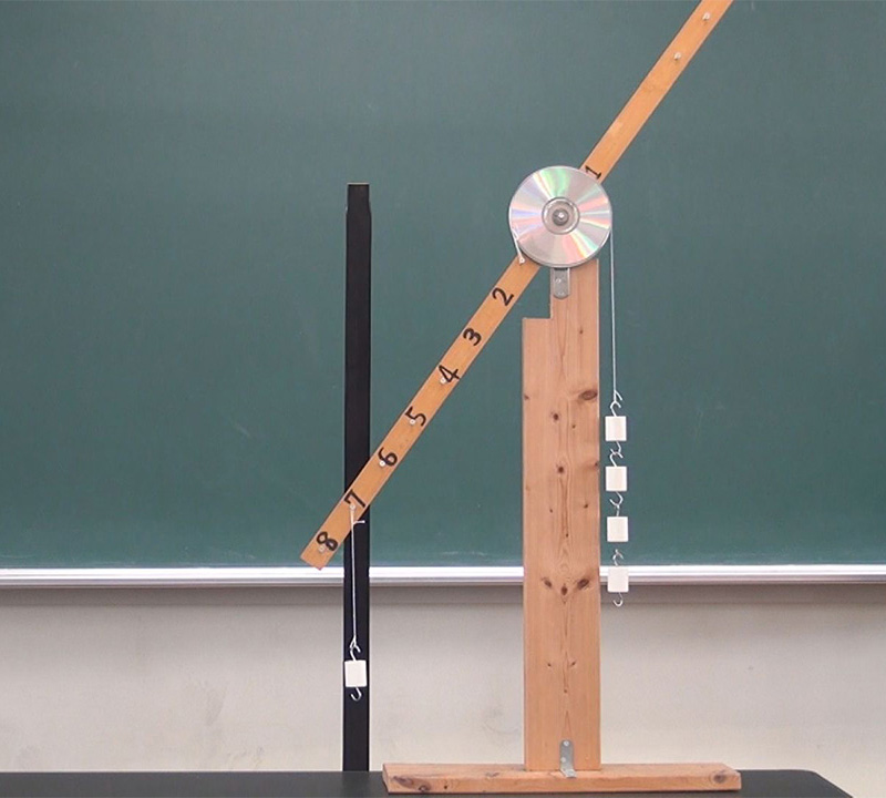 | 軸周りのモーメントは、次のように考えると正解にたどりつけます。 右側のおもりの腕の長さは、回転したとしても L に固定されています。 一方、左のおもりは、回転すると 「回転中心」から、「おもりにかかる重力の方向」への垂線の長さが変わります。 ここで左右のバランスがとれるためには、左のおもりの「腕の長さ」(=モーメントの計算に用いる長さ)は 4L になるはずです。 (左) 4L * m = L * 4m (右) なので、答えは イ でした。 (実験器具も イ の形を示しています!) 全てまとめた動画はこちら ![]() これは、6L であろうが、8L であろうが、事情は同じです。 なので、以下の図のようになるとバランスがとれます。 ![]() |