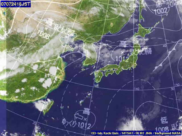 (気象庁・東京大・高知大提供のひまわり赤外画像と気象庁・メテオプラネット提供の天気図を合成)