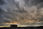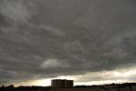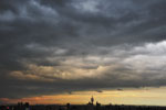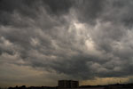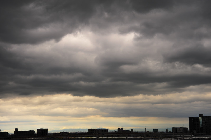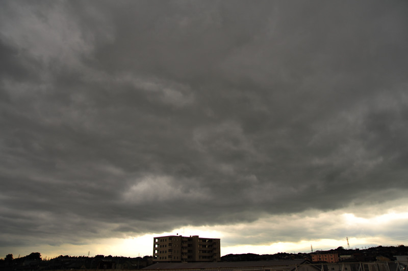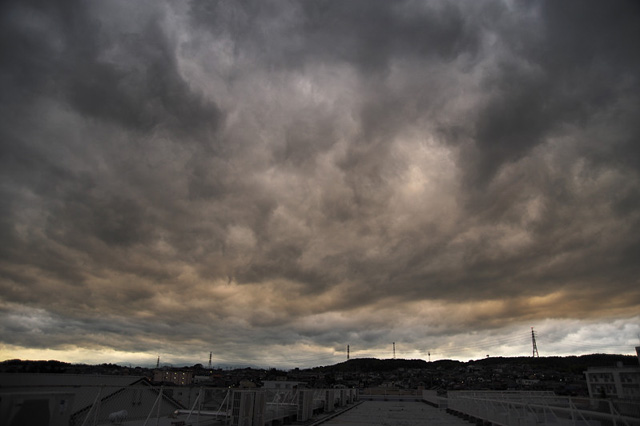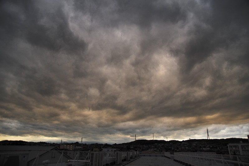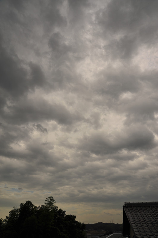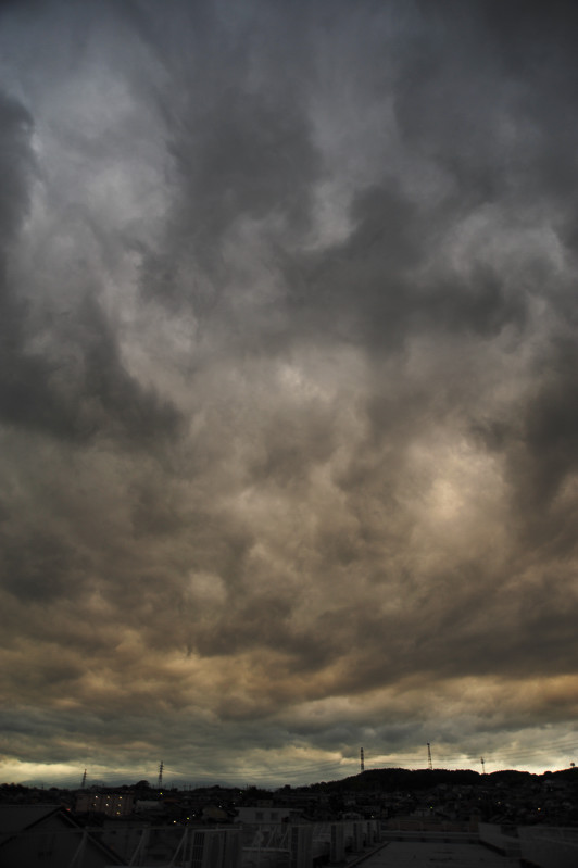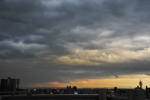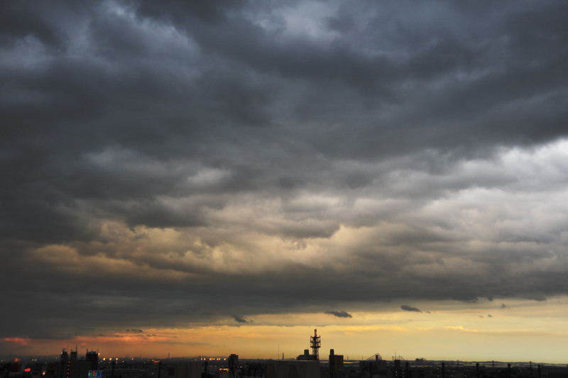 | 東西に長く延びる梅雨前線が、三重県北部にかかりました。 前線の活動は活発ではありませんでしたが、小雨の降る夕方。 乱層雲の厚みも薄かったようで、上空からの青い光と低空の夕焼け色がいりまじる、 なんともいえない美しい色彩の乱層雲でした。 |