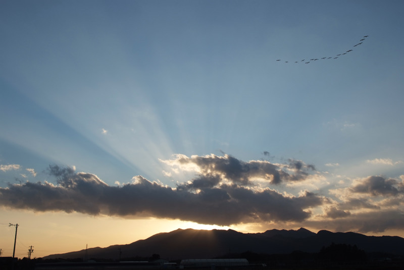 「鳥渡る 光芒の夕空」