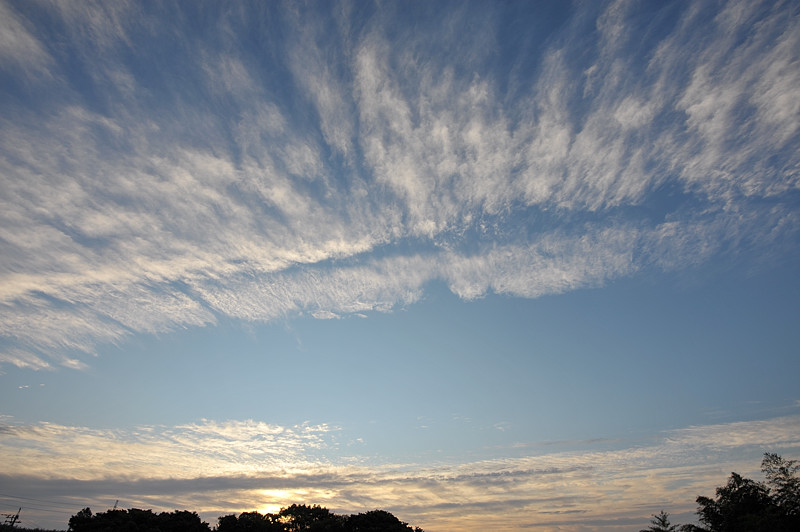 | 西から近づく高気圧にゆるやかにおおわれてクリアーな青空! 南東の海上に伸びる前線の雲がずっと低空に見えており、朝の空には巻積雲や高積雲、 また、その尾流雲などが見られ、それ以降も飛行機雲が変化したような上層雲が空を渡って いきました。 |