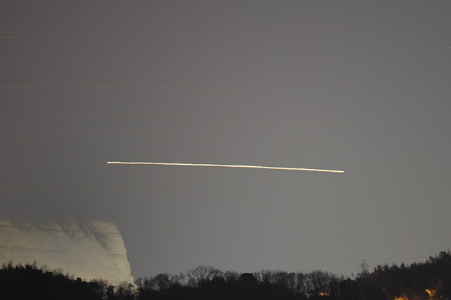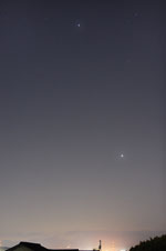 | 朝の最低気温−0.3℃、日中の最高気温4.6℃(桑名)、とても寒い一日で、日中には積雲から 大きな雪が舞っていました。 快晴の宵の空には、木星(左上)と金星が(右下)が煌々と輝いています。 もっと低空には水星も見え始めてきており、来週はここに新月過ぎの月がやってきます。 2月23日(木)・・・月齢1.4の月と水星が接近 2月25〜26日(土〜日)・・・金星と月が接近 2月27日(月)・・・木星と月が接近 双眼鏡でながめて楽しんでみたいものです。 もう1枚の写真は、カノープス(りゅうこうつ座)の日周運動。南の地平線すれすれに顔を出す1等星 です。大晦日にはちょうど深夜頃の南中でしたが、この時期は三時間ほど早まっています。 (1ヶ月で二時間早まります。) |