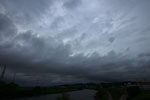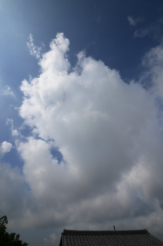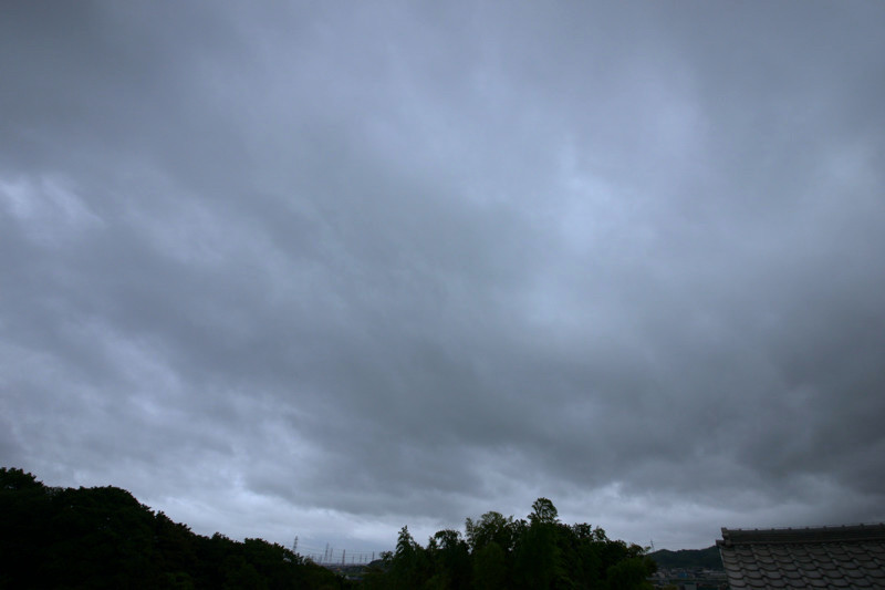 | 南東から暖かく湿った空気が流入して、朝から低く大きな積雲が目の前にそびえました。 昼頃から停滞前線が接近し、雨。夕方の雨雲も低くおおいかぶさってくるような圧迫感がありました。 桑名では最高気温が26℃くらいでしたが、日本海側ではフェーンがおきて、35℃を越えた所があります。 |