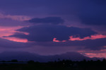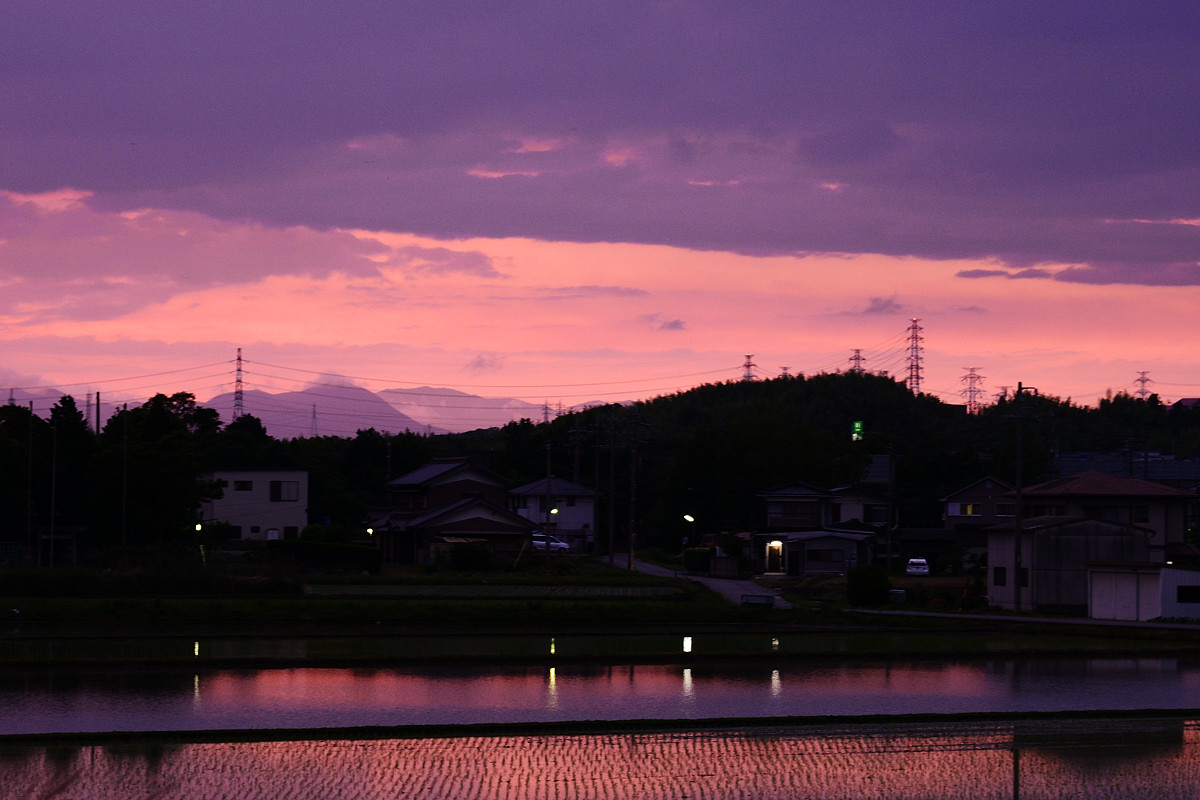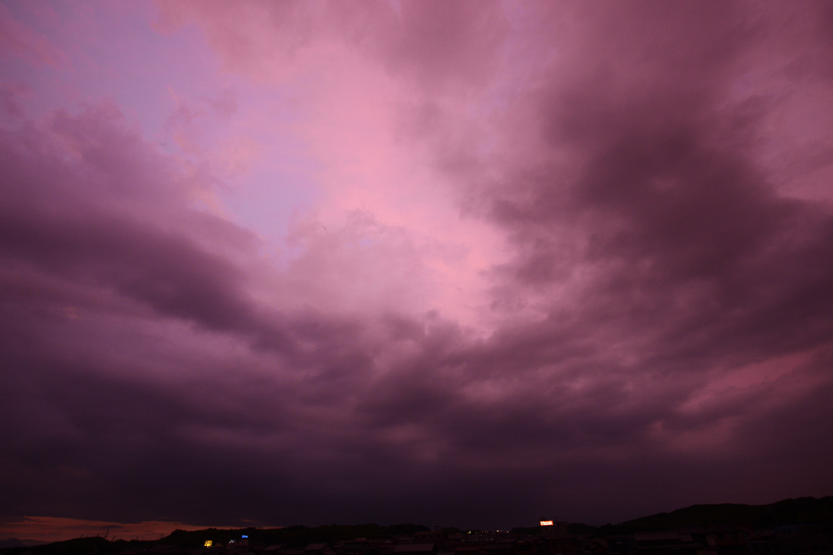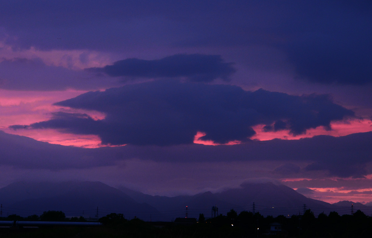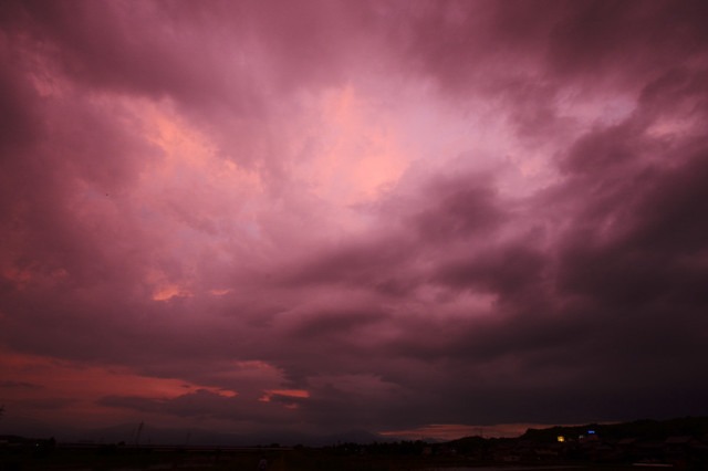 | 雨があがって乱層雲が消えてゆくときに夕暮れとなり、不気味な赤色に景色が染まりました。 これは、上空に残る高層雲や高積雲が夕焼けに赤く染まり。まだたくさん残る下層雲の隙間から こうした光を見ているためです。梅雨の季節に独特の夕焼けの色です。 |