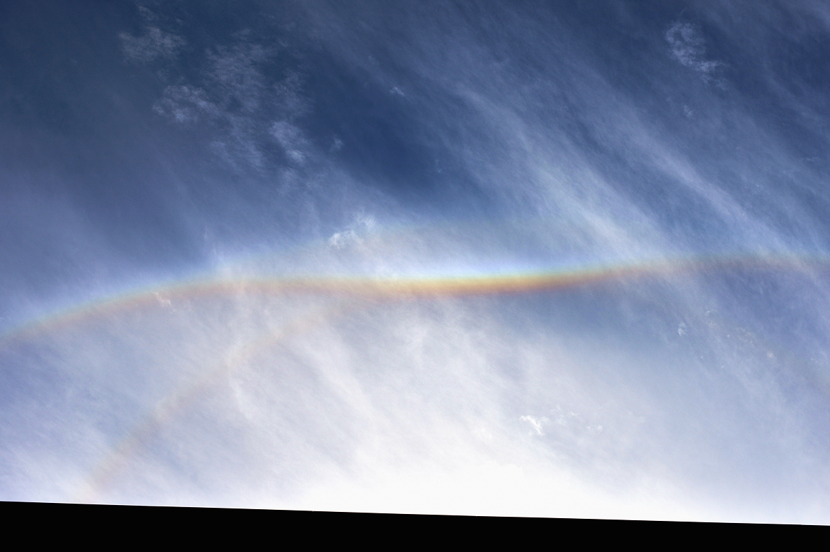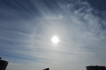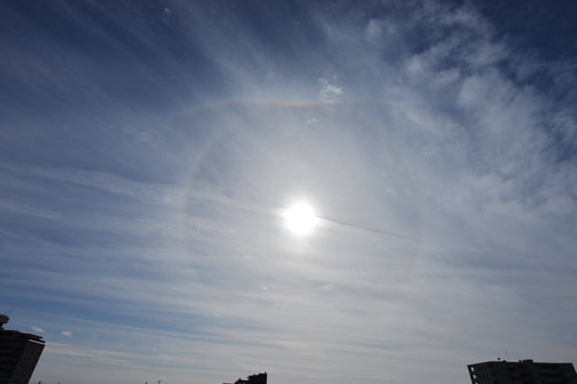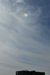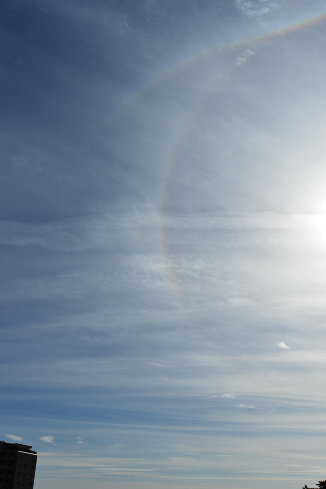 | 昼休み、建物の上にぐんにゃりとしたカーブを描く虹色の輝き! みごとなタンジェントアークです。 パリーアークも伴っています。すぐに開けた場所に移動して全体像を撮影。まるで口ひげのような 形で太陽の22°ハロの上部に接するカーブをなしています。タンジェントアークの形状は太陽高度に よって変わります。このときの太陽高度は30°。太陽の左右にあらわれる幻日もときどき明るく輝き ました。 |