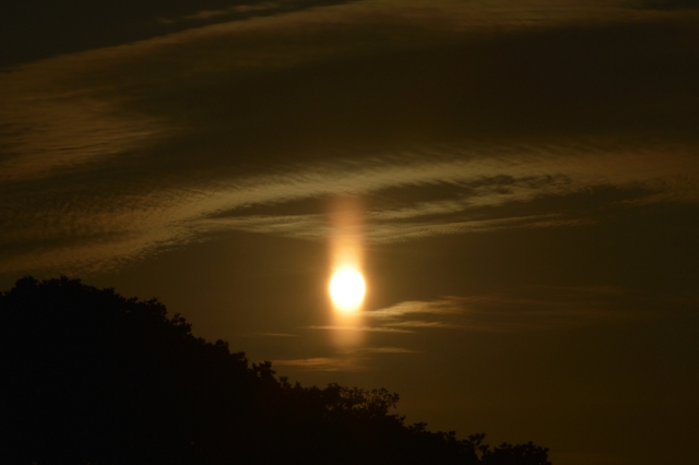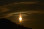 | サンピラー(太陽柱)は、平面を水平にした姿勢で漂う氷晶による太陽光線の反射によって生じる現象。 ふだんは巻層雲の氷晶によって生じるものを見ることが多いのですが、寒い冬の日には、低い雲の 下に降る氷晶によって生じる、強烈なものを見ることがあります。もっと寒い地方では、目の前に降る 氷晶が輝いているのも見られ、これがもっともサンピラーらしいといえるかもしれません。今朝のものは 1枚目の写真のようなレンズ雲の近くに漂う氷晶によって生じたサンピラーです。写真の露出は、ISO100 で、絞りは最小絞り、シャッター速度は最速。レンズによっては減光用のNDフィルターが必要になりそうな 被写体です。 |