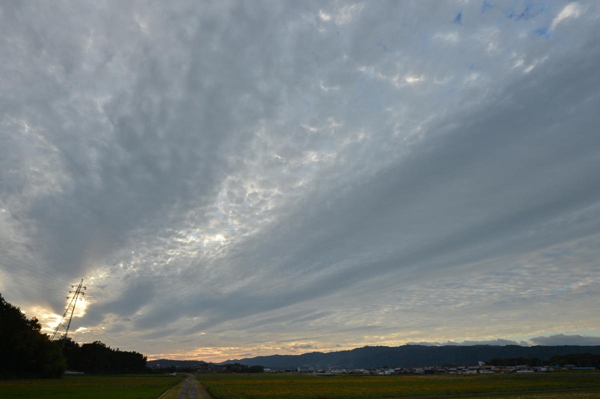 | 厚い高層雲に覆われる一日でしたが、夕方に隙間ができ始め、まるで浮き出してくるかのように 高積雲の二重雲ができあがりました。なかなかみごとな夕焼けも続いたのですが、運転中で撮影 できず。 伊賀上野は上野天神祭が始まって、町の雰囲気がいい感じ。久しぶりにゆっくりと祭りの町を 歩いてみたい気がします。 |