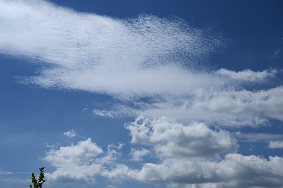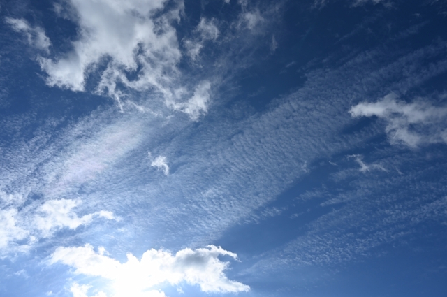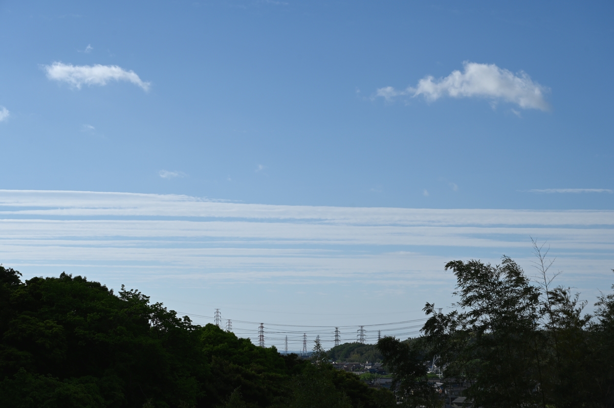 | 前線が去って、朝の南東の空にはその名残の雲。 朝から気温が高く、桑名で最高気温がまたも29.9℃と真夏日の寸前。 湿度が低く、風があったので、さわやかな空気感。 朝は、前線通過後の晴れ上がっていく過渡期で、下層の積雲や上層の 巻積雲が重なって見られる美しい空。午後には雲のない快晴の空に なりました。 |
