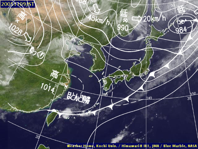| 地上(気象庁・東京大・高知大提供のひまわり赤外画像と気象庁速報天気図を合成) | ||||