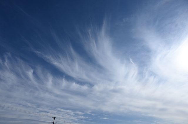| 高気圧に覆われた晴天でしたが、東シナ海に低気圧の発生しそうな 前線があり、その北東側に広がるバルジの雲域がかかってきました。 多様な巻雲や巻層雲たちです。 まず目についたのは、大きく広がり始めた飛行機雲に生じた鮮やかな 幻日。次に、巻雲の房状雲や、放射状の巻雲。上下のタンジェントアー クや22°ハロなども見られ、いつまでも眺めていたいような美しい空でした。 |