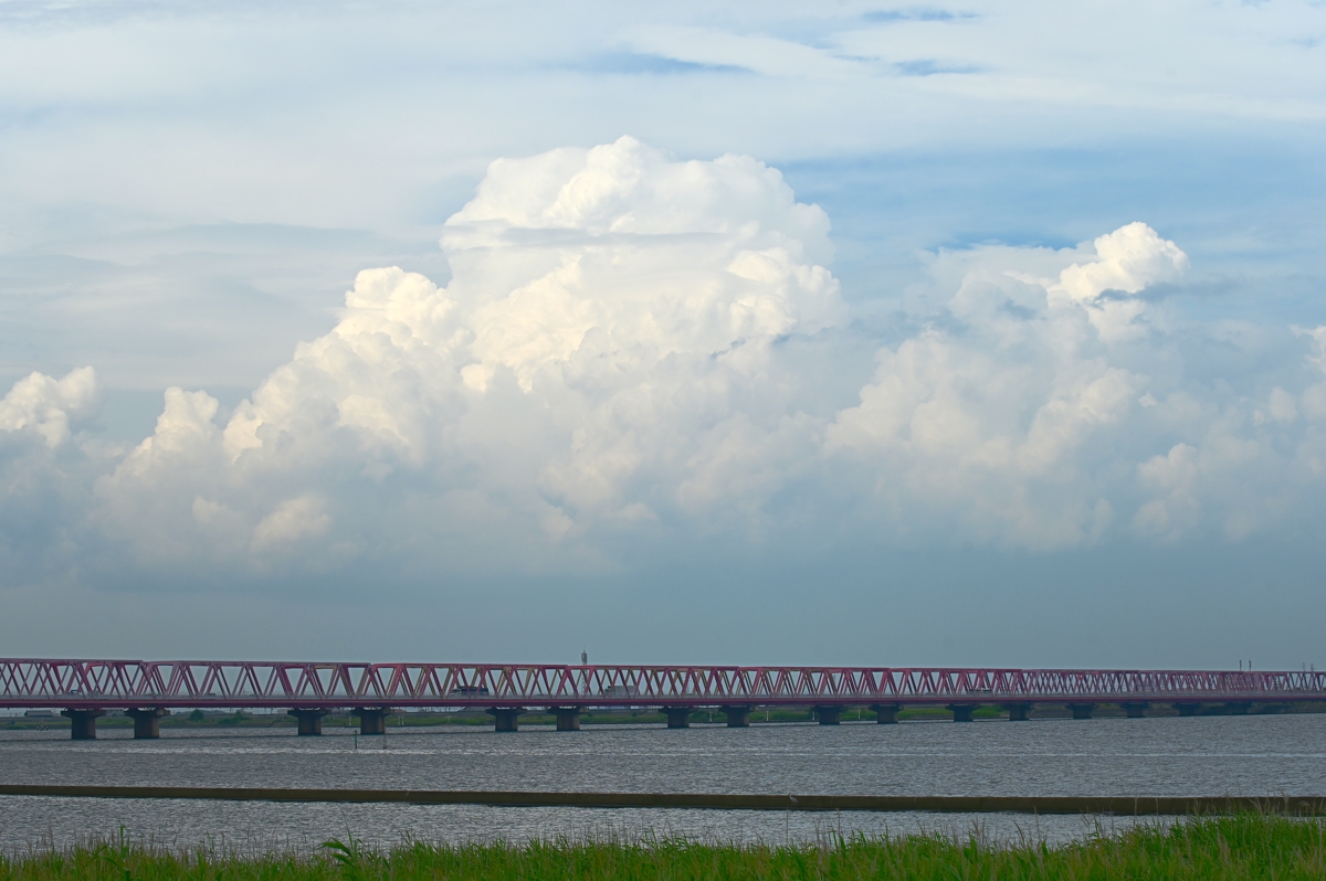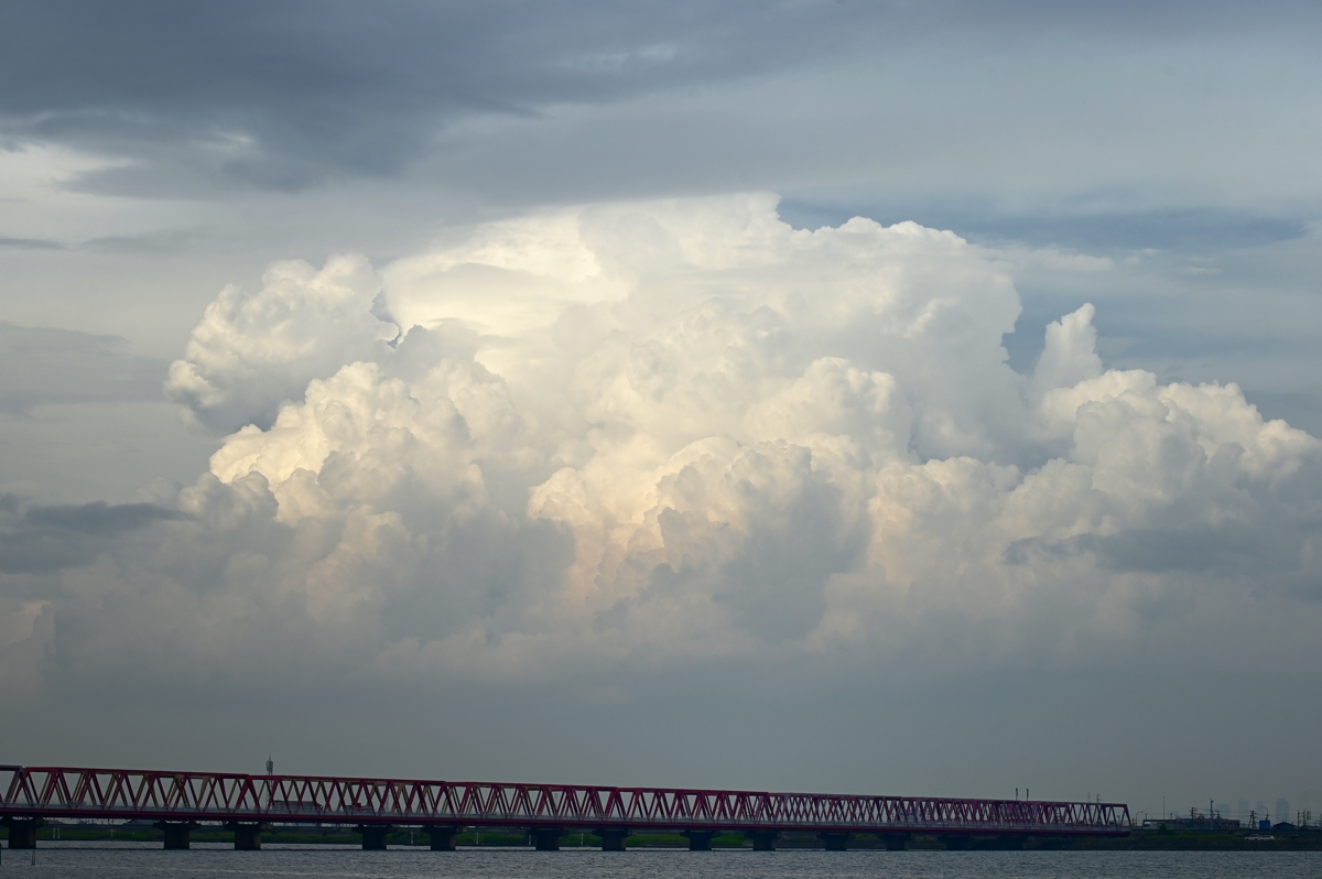 短くなった梅雨前線が日本海にあり、南西から暖湿気流が 流入して、大気の状態が不安定。 連日の熱帯夜があけ、今日も朝から気温がぐんぐんと上昇。 桑名で12時01分に34.2℃を記録し、猛暑日まっしぐらでしたが、 昼頃から雷雨となり、気温上昇はストップ。東海3県で竜巻注意 情報のニューステロップ。群馬県伊勢崎では40.2℃とのこと。 雷雨の後、雲の撮影に出たところ、雷雨の名残の雲がぐちゃ ぐちゃと有って、遠方を見通せない状況でしたが、やがて、 御岳山方面と伊勢湾方面に大きな積乱雲のあるのがわかって きました。伊勢湾の積乱雲は、西からの風で次々と新しい雲が 発達しつつ、東方に流れていきました。部分的な対流で持ち 上がる雲には小規模なずきん雲やベール雲も。 16時33分、東方にのこる降水に太陽光があたって、淡いながら 空中に虹が見られ、内側が赤っぽく見えたので一瞬、副虹?と 思いましたが、色の順序を見るとこれは主虹。内側に過剰虹が 現れていたようです。 伊勢湾の積乱雲は夕方のサイド光を受けてコントラストが高まって いきましたが、観測地点も雲に覆われてふたたび雨になってしまい、 積乱雲の全貌は見えなくなりました。 |