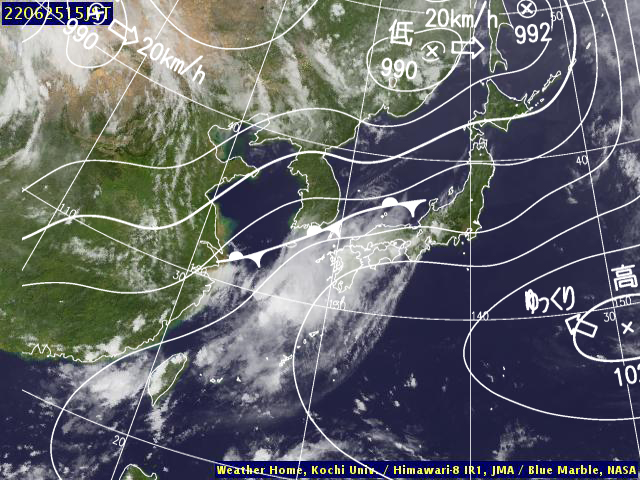 | 地上(高知大学気象情報頁赤外画像と気象庁速報天気図を合成) | |||