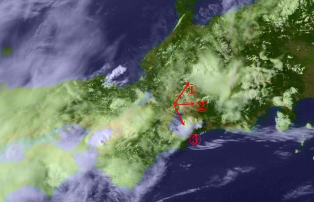 | 高知大学気象情報頁可視画像 16時 石川県にロール雲のような雲が見られる。 @〜Bは、掲載した雲写真に対応する積乱雲の番号。 |