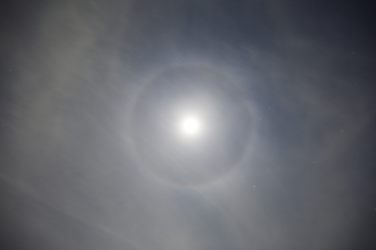 | 朝から快晴で気温が上昇。桑名では最高23.4℃。 夏日になった地点もありました。 夕方から巻雲が見え始めて、夜になって巻層雲が広がり、 月齢10.8の月のまわりに22°ハロがくっきりと現れました。 満月に比べると月の光は弱いものの、明瞭なハロで、 冬の星座の明るい星々もしっかり見えており、とても 美しい月夜の景色になっています。(22時) |