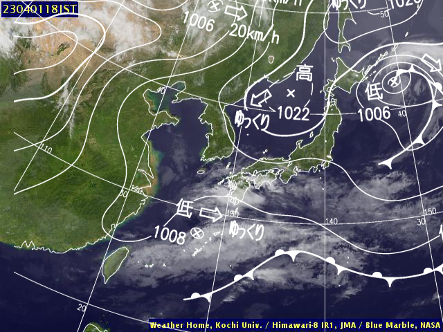 | 地上(高知大学気象情報頁赤外画像と気象庁速報天気図を合成) | |||