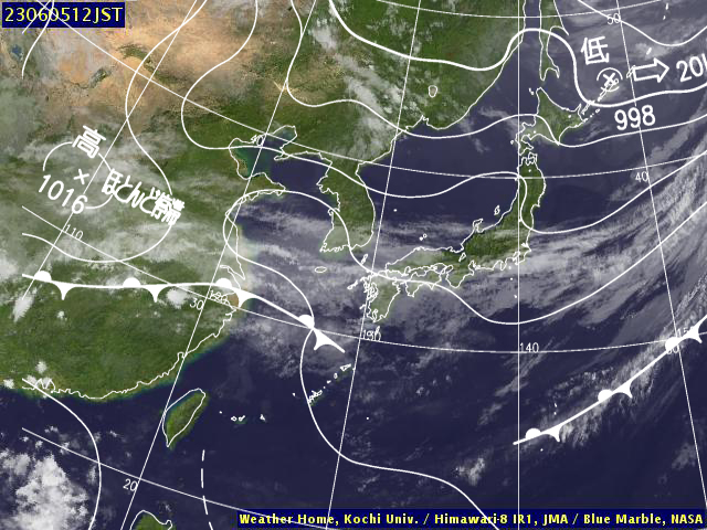 | 地上(高知大学気象情報頁赤外画像と気象庁速報天気図を合成) | |||