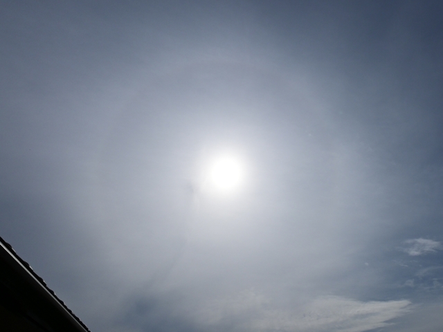 | 梅雨前線は南下して途切れていますが、上層・中層の雲が 東西に延びてやって来ました。朝には巻層雲の霧状雲で 22°ハロが生じていました。その後、青空と高積雲の空。 日没後、ピンク色に染まる夕焼け雲(たぶん高積雲)も。 |