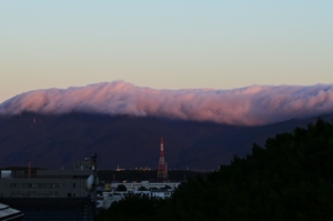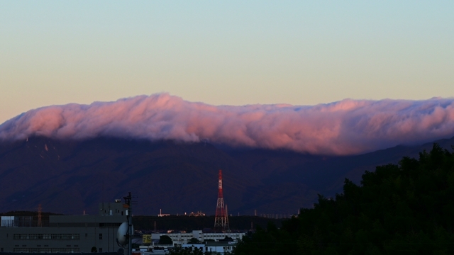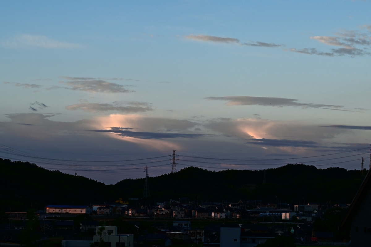 | 昨夜はおとなしめの雷雨があり、朝の空には梅雨前線が 南に通過した名残で、日の出に赤く色づく山脈の風枕。 そして東海地方は梅雨明け。梅雨前線が南に移動しての 梅雨明けで、明瞭ですっきりした天気の境とはならないかも しれません。前線北縁の雲も南の空に見えていました。 午後は、濃尾平野の周辺部にたくさんの積雲が発生し、 その中で桑名から見て東北東の方角に積乱雲が発生。 雷情報(中部電力)をみると、愛知県の奥三河方面で 雷の活動が記録されており、その積乱雲のようです。 |