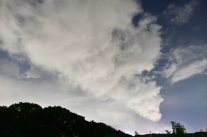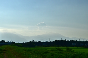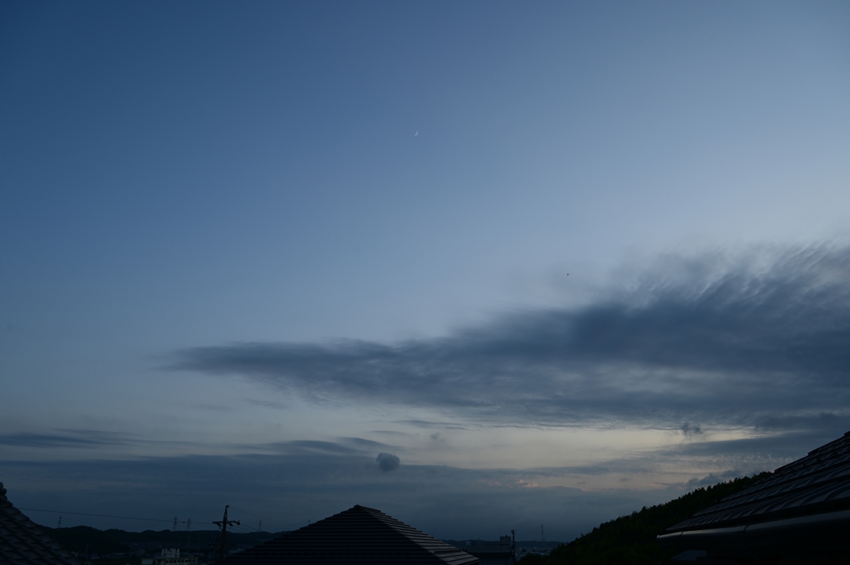 | 前線が大きく南下していて、陽射しは強いものの冷涼な 風が吹き、夕方には30℃以下になって夕涼みを楽しめました。 写真(上)は工場の排気に含まれる水蒸気がもととなって 少し高度が上がった場所から凝結して雲となり広がった 人為起源雲です。 写真(下)は、鈴鹿山脈に積雲が見られる所よりも平地側で うっすらとたなびく層雲。積雲があるときにできたベール雲の 名残にも見えますが、単独の層雲となっています。 |