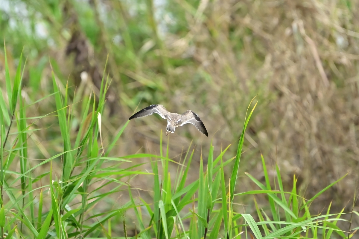 | 夕方の観察。 員弁川の増水は今日も継続。 最もよく留まっていた場所が流されてなくなり、昨日・今日と近辺の いろいろな場所に現れましたが、撮影のタイミングを逃しました。 暗くなってからですが、ホバーリングも2回。 撮影はツバメ・イカルチドリの飛翔。 あと灰褐色のたぶんモズ・・・ですが、いまだよくわからず、です。 |