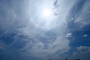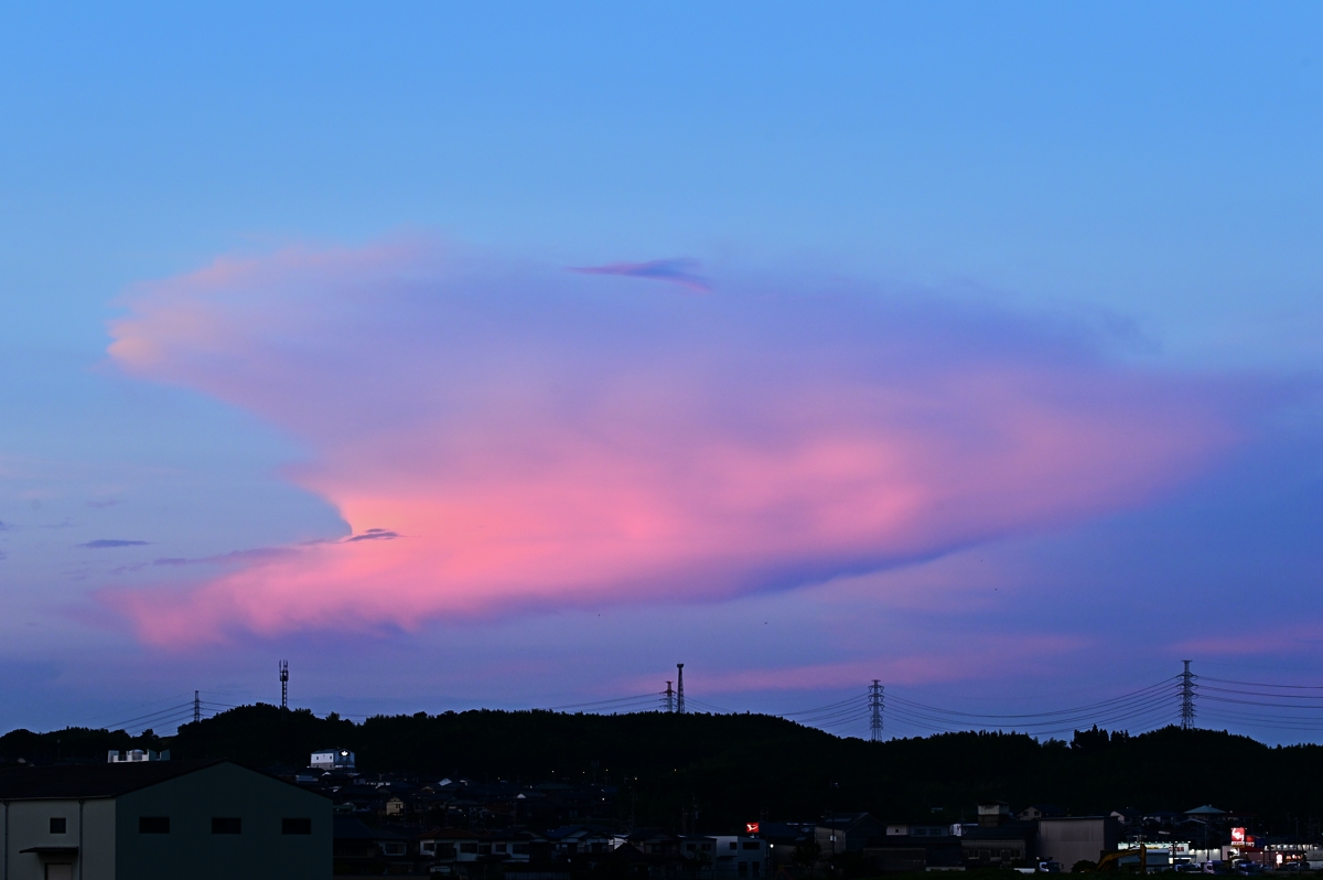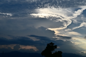| 昼頃の巻層雲に、環水平アーク。 太陽高度が高いという必要条件から、4〜9月の昼頃が好機ですが、 今シーズンは、4月28日・5月3日(この日は見事)・5月18日・5月27日と 見られたあと、6月・7月には運悪く出会えず、今日は久しぶりでした。 日没前に、岐阜県下呂方面で積乱雲が急発達。 日没後には、終末期の積乱雲の形状になり、真紅に染まっていきました。 ほかにも、鈴鹿山脈にかかる笠雲や、積乱雲か雄大雲の 残骸のような雲に乳房雲が見られたりしました。 |