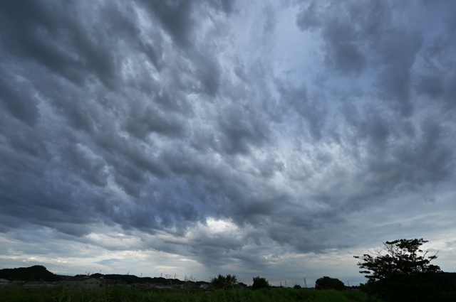 台風13号が関東へ向けて接近。 南東から起伏の激しい層積雲が流れ込み、何度も繰り返して にわか雨がありました。千切れ雲のような低い雲が来るのが 雨の降りやすい空だという傾向がありました。また、周囲の あちらこちらに降水雲のすじが見られて、遠方が明るい所では シルエットになってその様子がよくわかります。 |