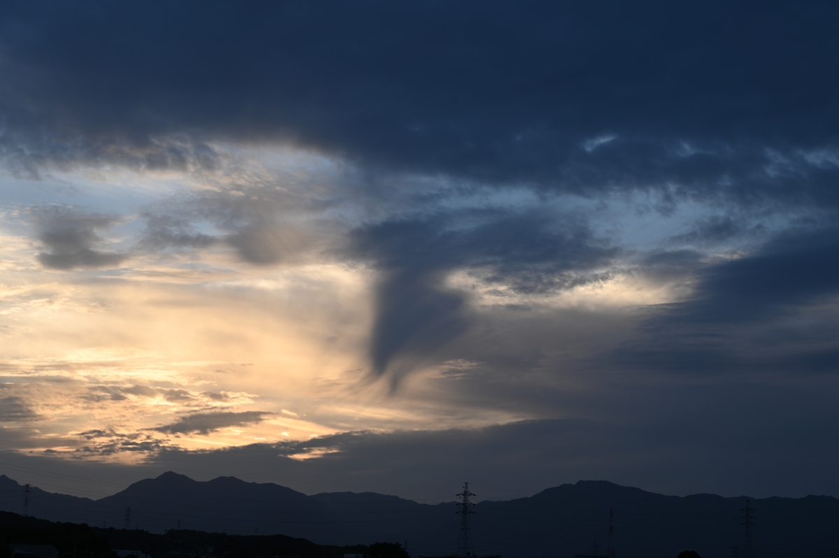 夕方、高積雲・高層雲が全天に広がり、山麓には層積雲。 西の空では遠方の高層雲か層積雲の上に尾流雲を伴った 穴あき雲。典型的ではないものの、尾流雲が落下しながら 雲が蒸発しているようでした。この位置が太陽の右方約22° に近かったので注視し続けていると、期待通りに幻日が 現れました。上層の尾流雲ではないように見えましたが、 氷晶からなる尾流雲であったことがわかります。 |
