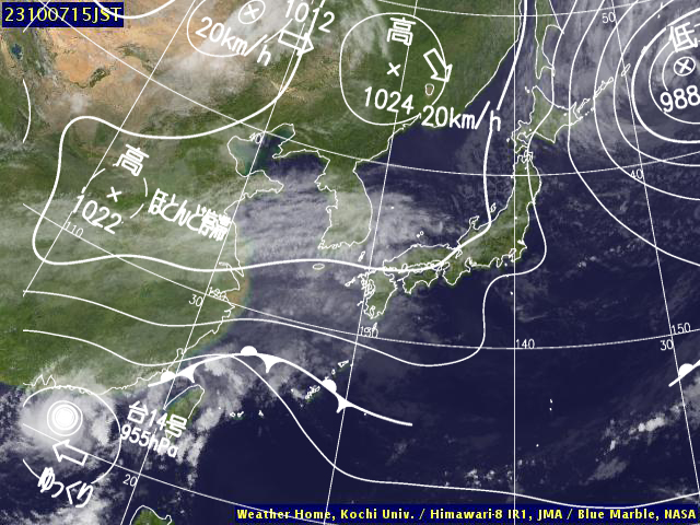 | 地上(高知大学気象情報頁赤外画像と気象庁速報天気図を合成) | |||