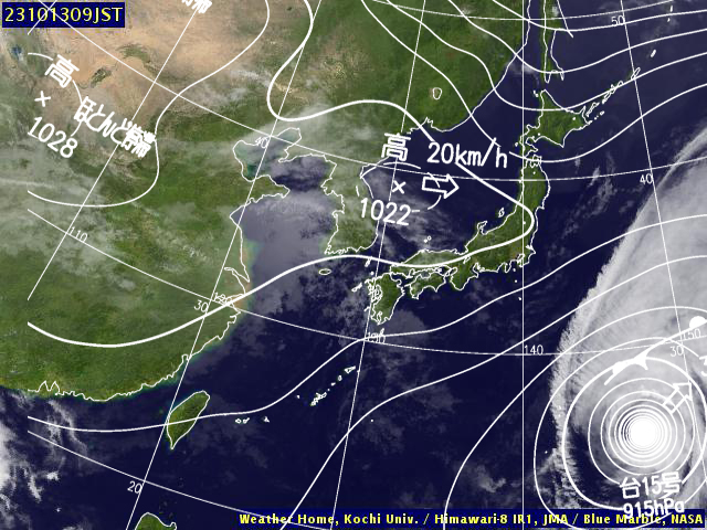 | 地上(高知大学気象情報頁赤外画像と気象庁速報天気図を合成) | |||