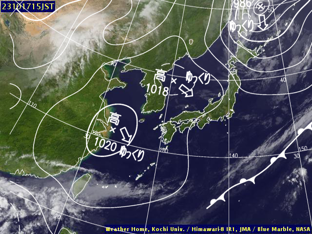 | 地上(高知大学気象情報頁赤外画像と気象庁速報天気図を合成) | |||