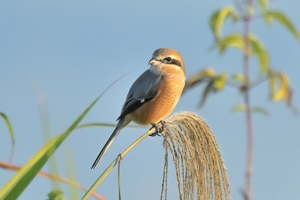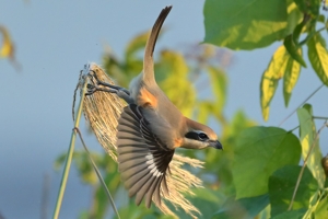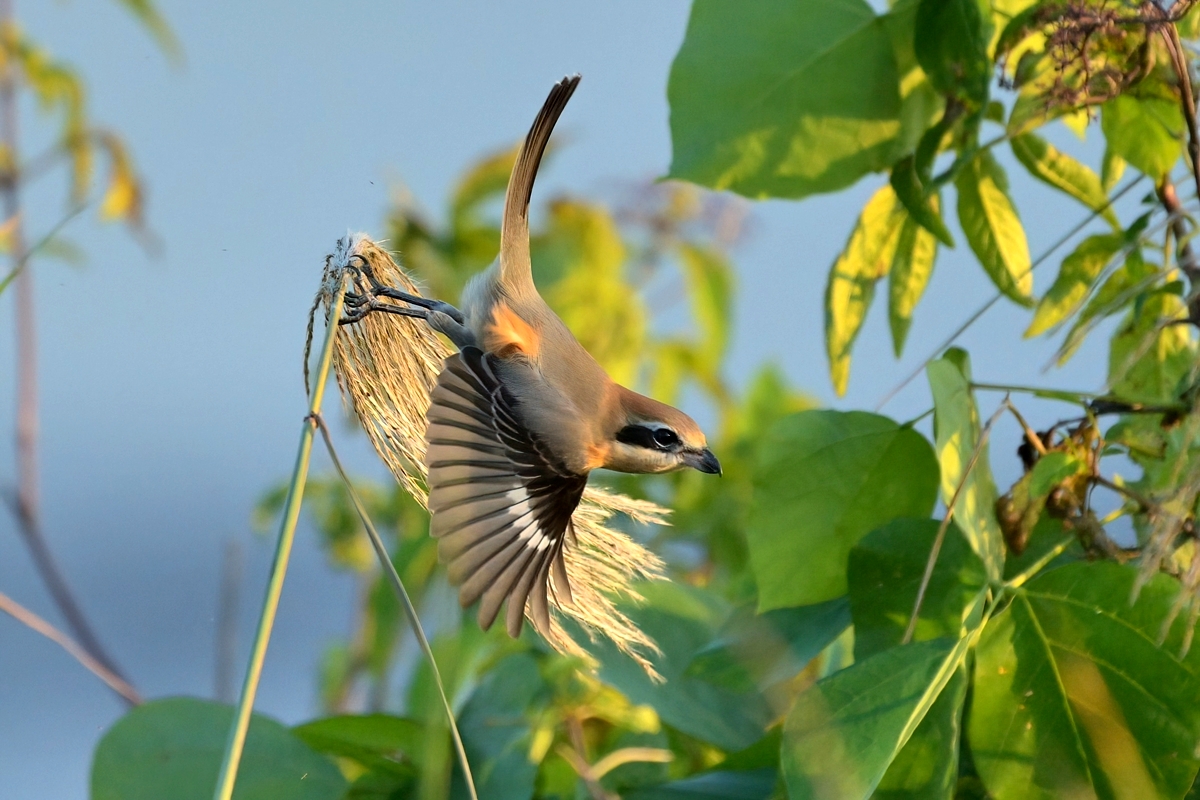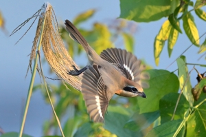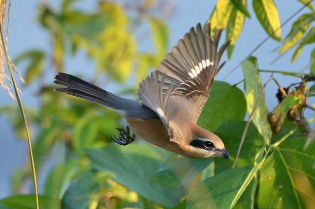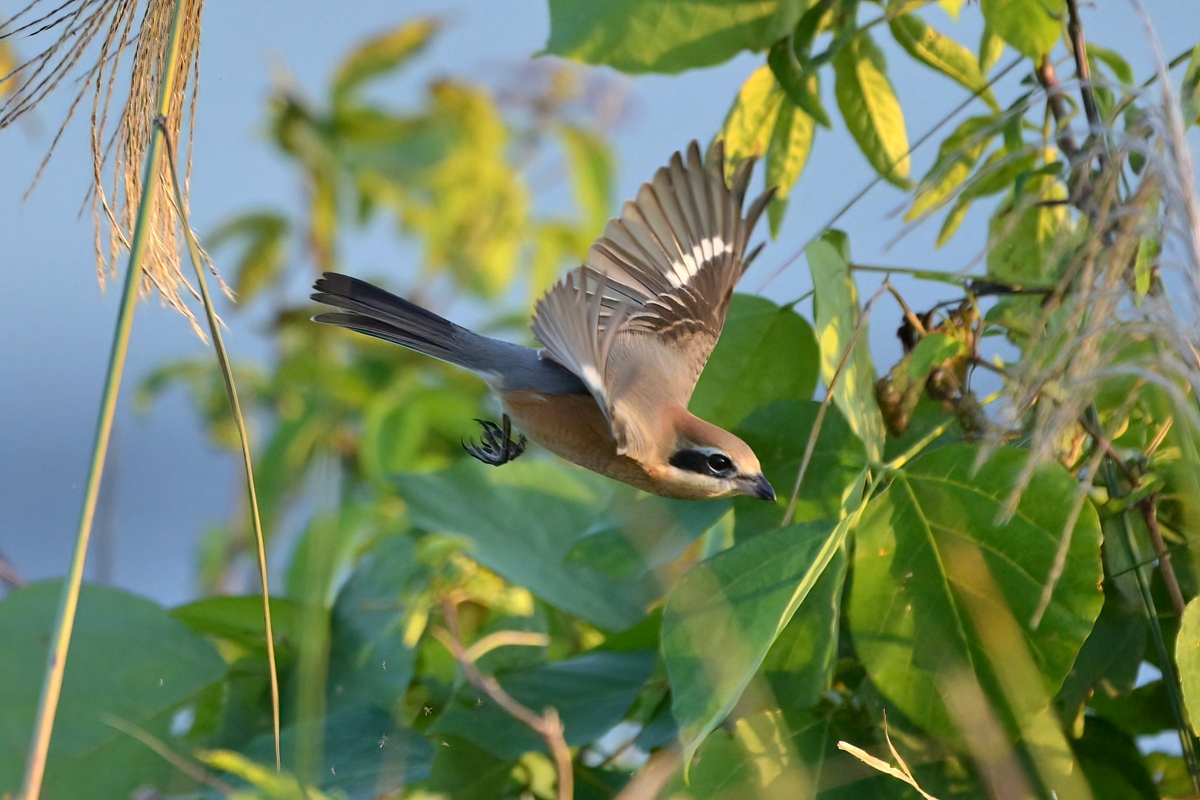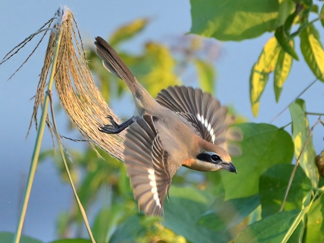 | 樹木の高い場所に留まりがちなモズは、その飛び立つ姿がほぼ 翼をたたんで落下するものがほとんどでしたが、今日は草むらの ススキに留まった状態を10分間ほど保ち、その後、落下しながら 翼を大きく広げて羽ばたく姿を見せました。光線状態も良好で 1/3000秒のシャッター速度で撮影しました。減衰曲線を描くような 軌道での飛び立ちは、なかなかユニークで美しい姿です。 ほかにはキセキレイが現れるも、カワセミは見られず、でした。 |