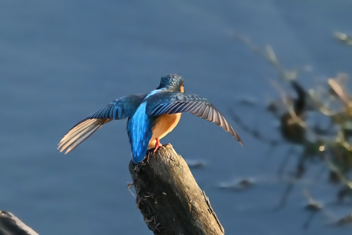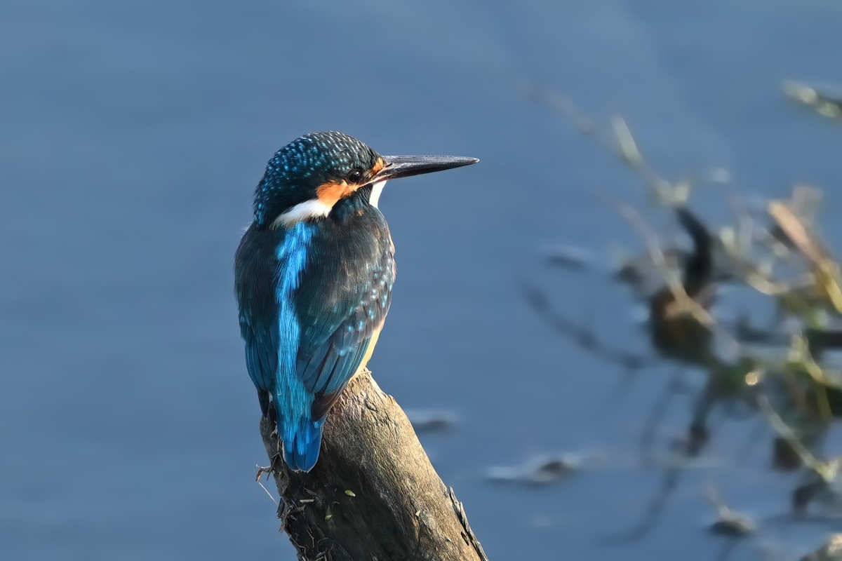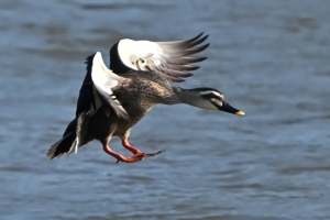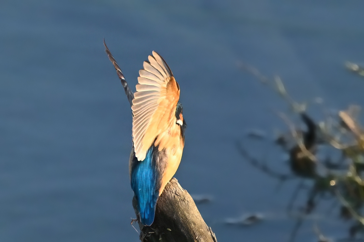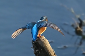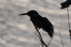 | 昨夜の雨で増水した員弁川にて。 これまでつねに群れていたサギ類やカワウ、カルガモに加えて、 コガモやマガモといった冬鳥のカモ類の群れが来て、かなり にぎやかになってきました。例年、冬鳥が群れる場所は少し 違う場所なので、時期によって変わってくるかもしれません。 いつもどおりに川に沿って飛ぶミサゴが来たあと、まだ早めの 夕方の明るい時間帯にカワセミが登場。増水した水面近くの 枯れ木から、水面に向かってコンパクトな飛び込みを行い、 小さな魚をキャッチして同じ場所に戻ってくる動きを見せました。 |