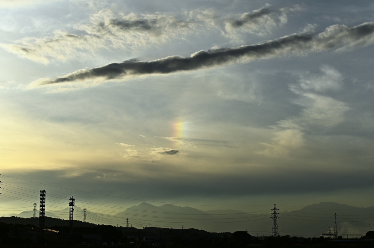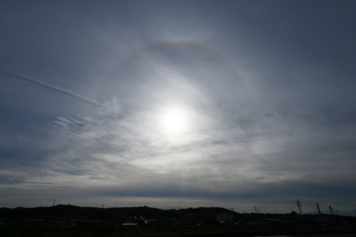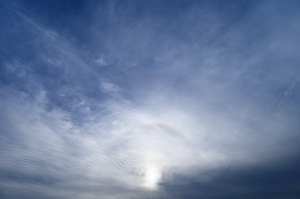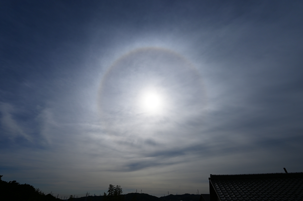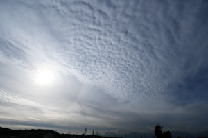 | 2つ玉低気圧の接近で、午前中から雲が増加。 巻層雲や高層雲の上部に主要な大気光学現象が次々と出現しました。 特に、午前中に現れた22°ハロはみごとなもの。幻日も現れては消え、 を繰り返して、ときどきとても明るくなりました。 今夜遅くから明日の昼にかけては雨の予報で、今日の 大気光学現象ラッシュはその前兆といったところですね。 |