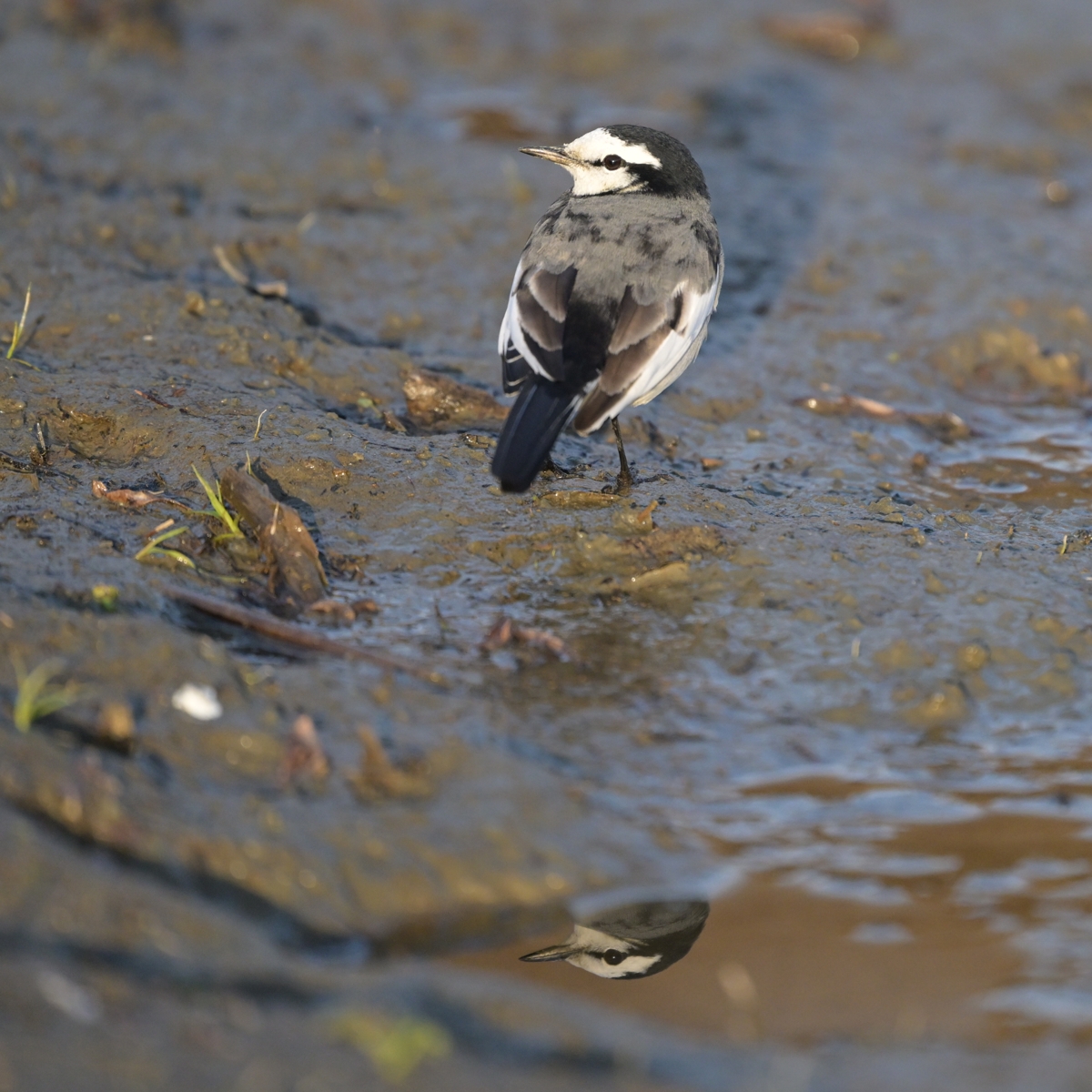 | 飛翔するサギ(?)の群れ | ハクセキレイ 水たまりに顔が映っている。 |