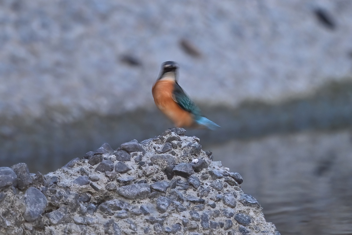 | 夕闇にカワセミ 被写体ブレ。とりあえず今日もいた。 |