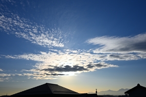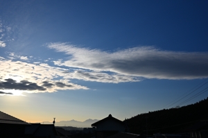 | 強い寒気の流入と放射冷却効果によって、桑名の最低気温は−1.2℃。 日中も快晴は続いて最高気温は11.4℃まで上昇しました。 西からは前線が近づいており、夕方の西空には鈴鹿山脈の影響を 受けた地形性の高積雲が、快晴の青空に浮かび上がりました。 |