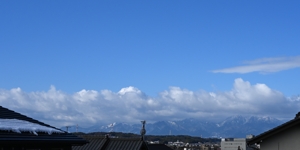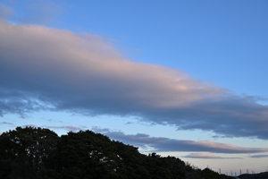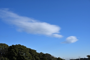 | 地上天気図で等圧線の間隔が広がり、西高東低の気圧配置が ずいぶんとゆるんできました。午前は厚みの小さい層積雲が広がり、 見た目の面積のとても大きな半透明雲が頭上に来たりしました。 鈴鹿山脈の積雲の上に青空が広がるのもこの地域の冬らしい空。また、 東方で場所を変えない長大な雲の消長が見られるのも冬らしいものです。 |