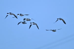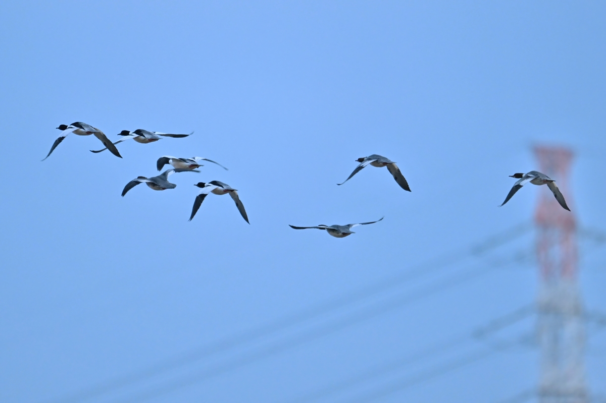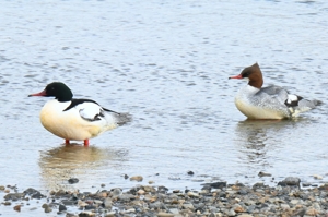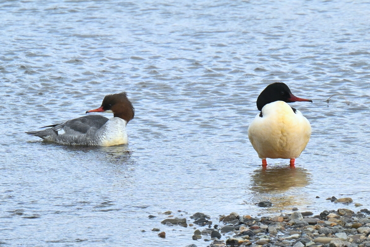 午後の員弁川にて。 遠いながらも撮影できる位置に、カワアイサのつがいが登場。 頭部が黒く、体に白い部分の多いのがオス、頭部の茶色いのがメスです。 オスがなかなか頭をあげてくれず、両者の顔が見えたところで撮影しました。 白黒の輝度差の大きいオスを撮るにはいまひとつの光線状態。 いつも遠くて見えにくい場所にいますが、撮影機会はじゅうぶんにありそうです。 |