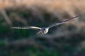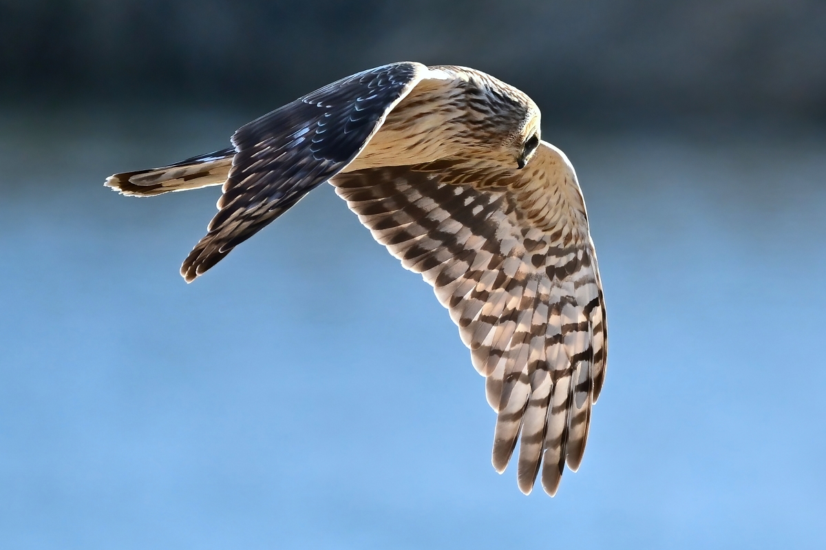 | 晴天の夕方、員弁川にて。 ワシタカ科の冬鳥、「ハイイロチュウヒ」のメスが登場! オスは上面の大部分が灰色で下面が白。ハイイロチュウヒのネーミングは おそらくオスの外観に由来するものと思われますが、今日のはメス。 メスは上面が褐色で翼下面に太い横線が特徴。腰の白色も目立ちます。 川岸周辺を何度か旋回し、その後登場したカワセミも逃げ回っていました。 先日来のコチョウゲンボウに続いて、今後も注目したい野鳥です。 |