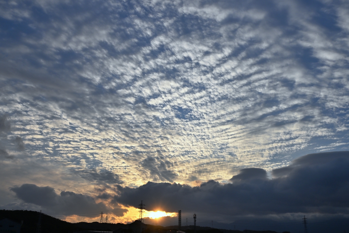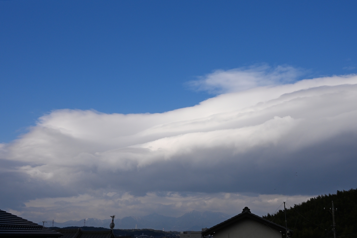| 南岸に長く停滞前線が延びていて、寒気流入も始まり、 多種多様の雲が入り混じった空。 山麓では積層構造をもった寒気流入の冬らしい雲。 一方では上層の巻雲や中層の高積雲も登場しました。 朝の気温は高めでしたが、夕方にはずいぶんと気温が 下がってきて、明朝は0℃近くまで冷えそうです。 |