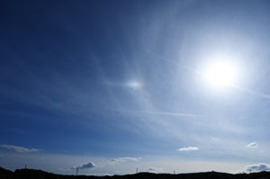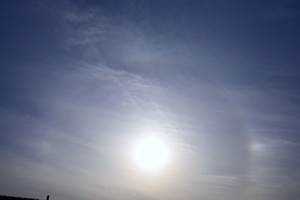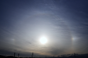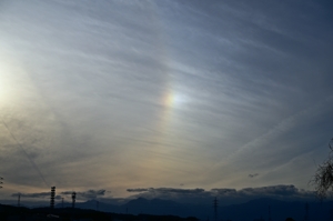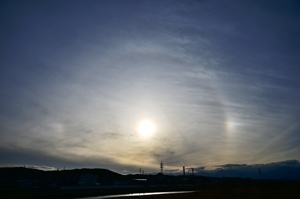| 南岸の停滞前線に沿う巻層雲が午後に北上し、14時ころから日没まで 幻日が継続して見られました。幻日は顕著に明るく、タンジェントアーク や22°ハロも断続的に現れ、ごく淡い環天頂アークも確認できました。 |