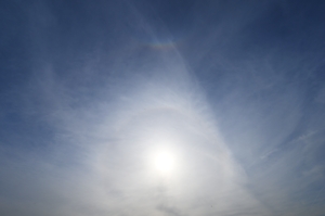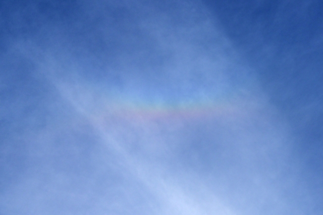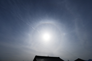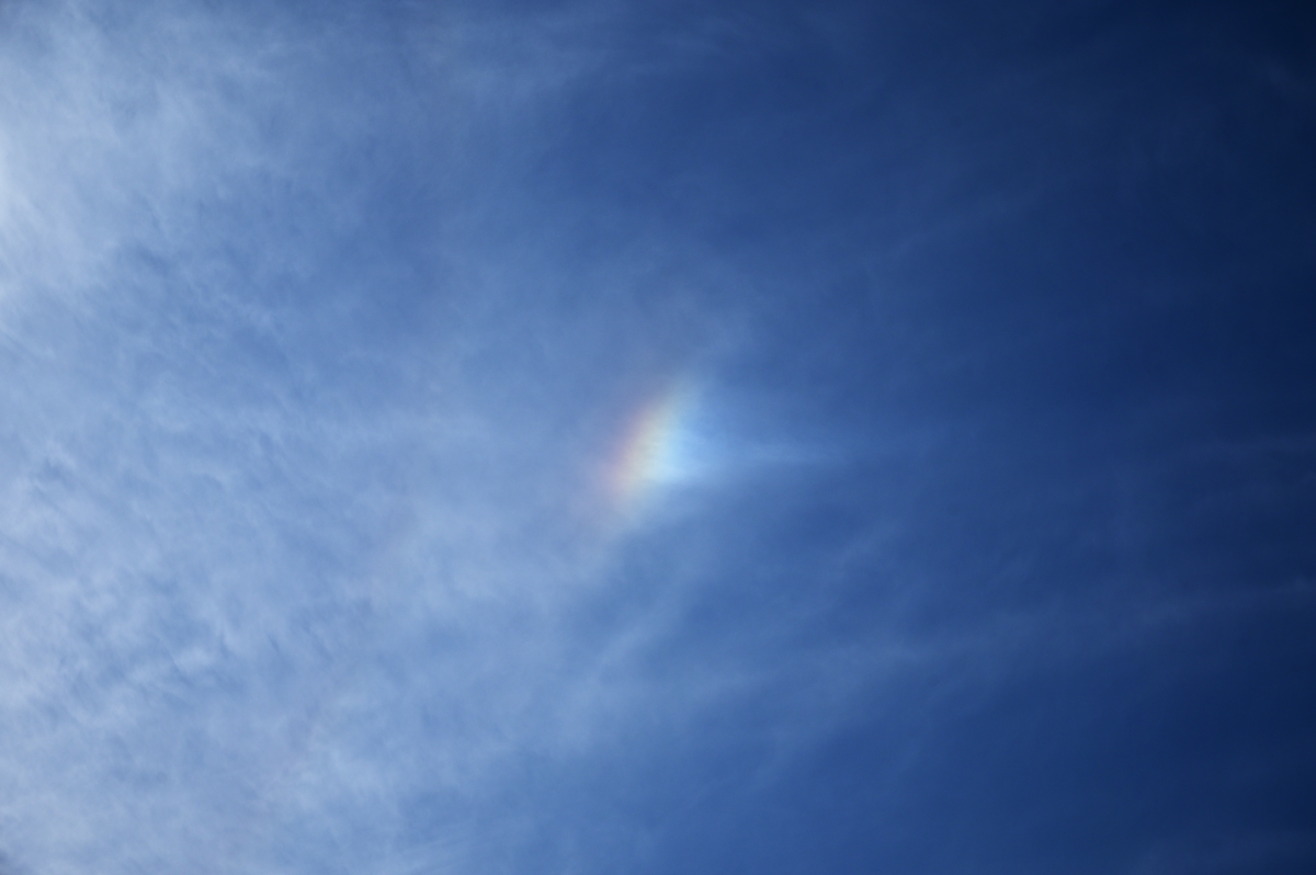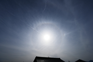 | 朝の青空に変異を始めた飛行機雲が1本。ここにとても鮮烈な幻日が輝きました! 午後になると巻層雲が空を覆うようになって・・・・・。 まずは、太陽高度が大きい状態での幻日。ハロから大きく離れています。 続いては、明るめのタンジェントアーク。 時々、やや不明瞭ながらパリーアークや、淡い幻日環を伴いました。 15時ころになって太陽高度が低くなってくると、環天頂アークも出現。 昨日につづき、今日も大気光象から目を離せない、素晴らしい午後でした。 |