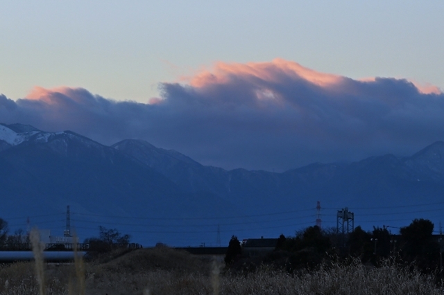 | 午前は冬の層積雲におおわれていましたが、高気圧の接近で 午後にはすっかり快晴の空になりました。風もおさまってきて 山脈にかかる雲だけが残り、日没後にその雲頂だけが赤く 光っているのがとても印象的でした。 |