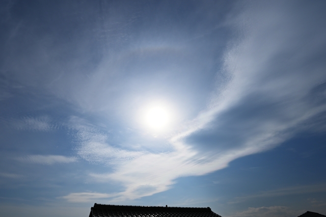 | 高気圧の後面に入って次の気圧の谷が接近。 午後、鈴鹿山脈沿いの長大な地形性の雲が発生し、それに つながるタイプの巻積雲や巻層雲が広がりました。 こうした巻層雲にタンジェントアークや22°ハロが継続しました。 気温hあ大きく上昇し、上野で最高気温19.6℃でした。 |