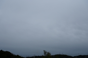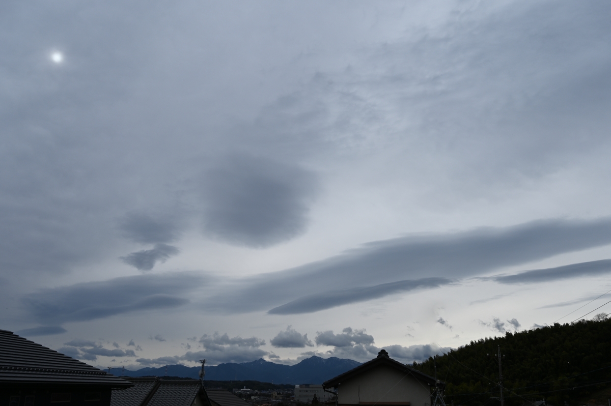 | 午前中は乱層雲で、今日も雨の天気。 停滞前線が南に離れて、午後には中層付近の気流によって 鈴鹿山脈の山麓に、高層雲下で長いつるし雲が発生しました。 同じ場所でわずかずつ姿を変化させる造形が素晴らしいものでした。 |