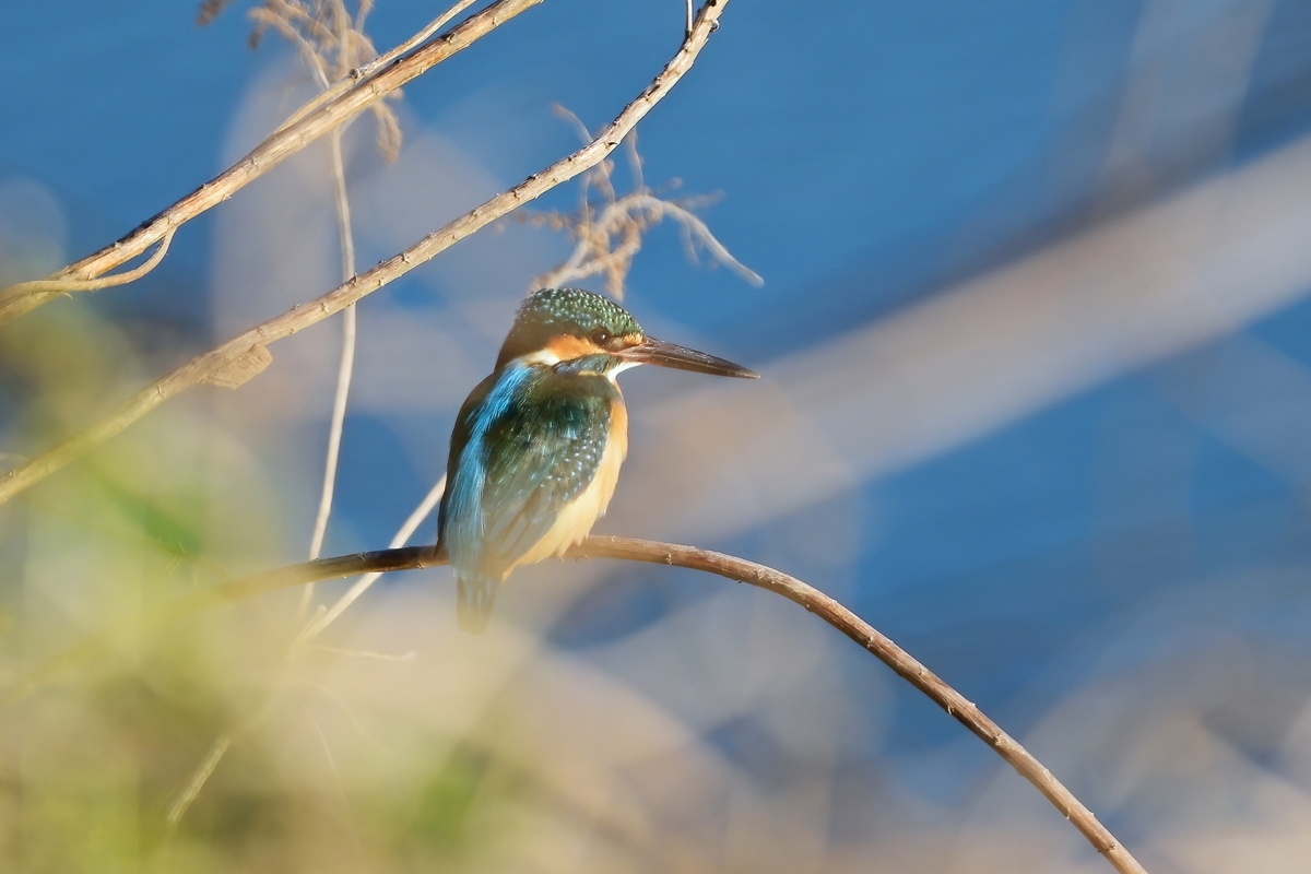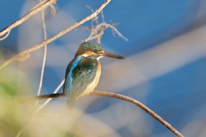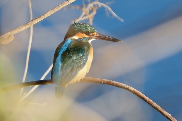 | 夕方の員弁川にて。 カワセミの活動範囲が上流側に広くなってきているのを確認。 ただ、上流側では河川の水路がクリークになっていて、カワセミを ほとんど見ることができない場所になっています。 いつもの場所では、最近は枝かぶりを避けられない所が お気に入りのよう。春分が近づき、夕方の太陽光線が半順光に なってきて、カワセミの色(構造職)も緑が強まって見えます。 川から突き出た樹木にも一瞬とまってくれました。 |