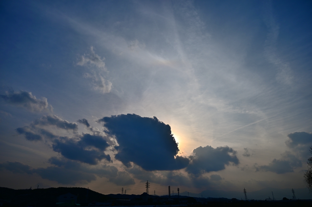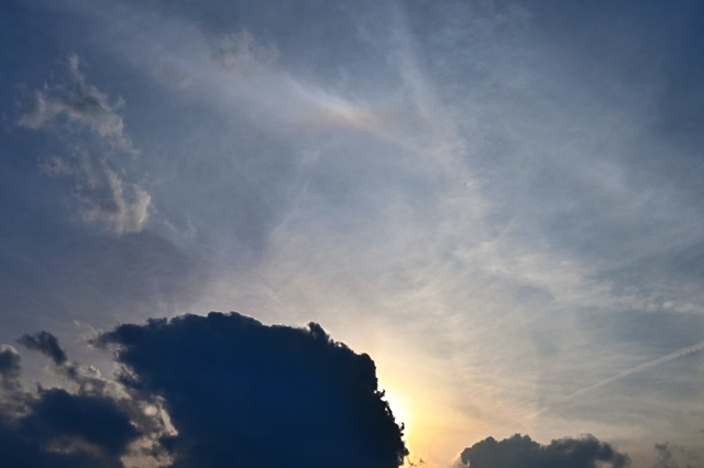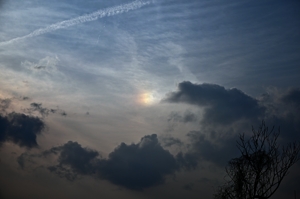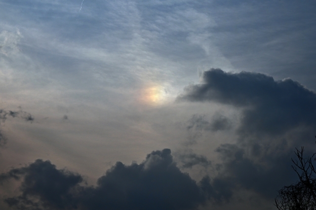 | 下層には荒々しい冬の積雲がやってくる中で、夕方になると 次の気圧の谷の接近を告げる上層の巻層雲がやってきました。 幻日とタンジェントアーク、22°ハロが見られました。 |