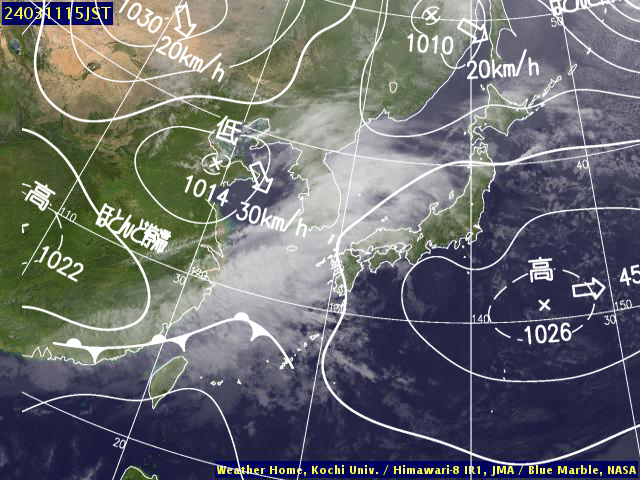 | 地上(高知大学気象情報頁赤外画像と気象庁速報天気図を合成) | |||