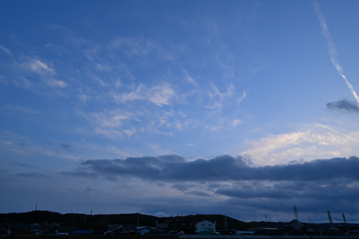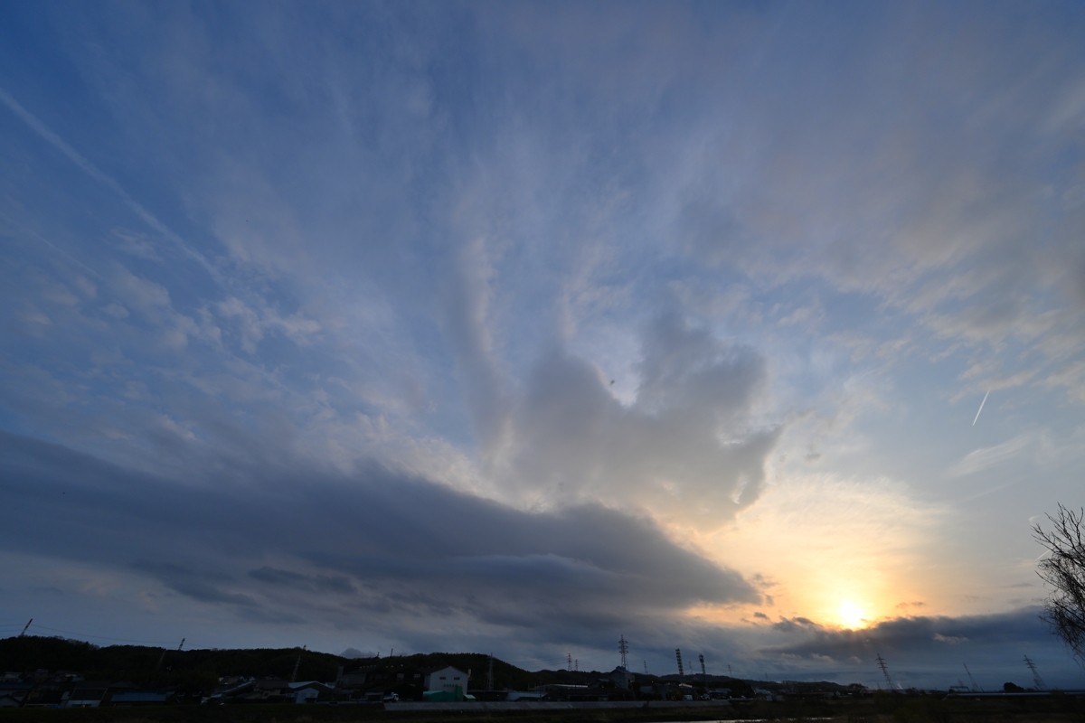 日本海には上空に寒気を伴う低気圧があって、 明け方から午後まで雨の天気。 夕方になって晴れ間が見え始め、下層の積雲・層積雲と 重なって上層の巻雲・巻層雲がやってきました。 |