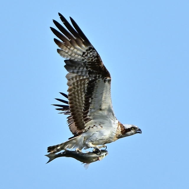 上流に向かって飛翔している姿です。右足で魚の頭部を、